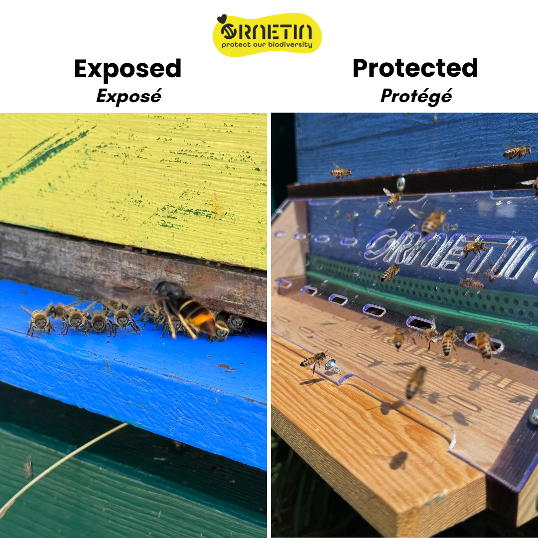 Chaque entrée est découpée au laser à 5 mm, assez étroite pour bloquer les frelons tout en laissant passer les abeilles en toute sécurité. Incapables d’entrer, les frelons se désespèrent et finissent souvent dans une piège Ornetin voisin.