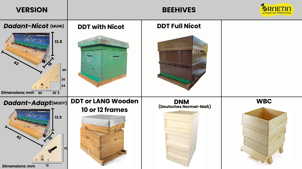 Conçue pour les ruches Dadant standards avec planchers Nicot (réducteur vert installé).